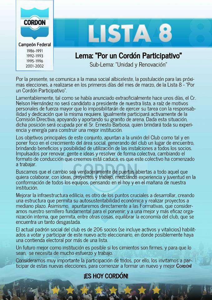 Mañana de 18 a 21 se votará en la sede de Cordón. Se presenta la lista 8, con Ernesto Barbosa como presidente y Pablo Hernández como vice.