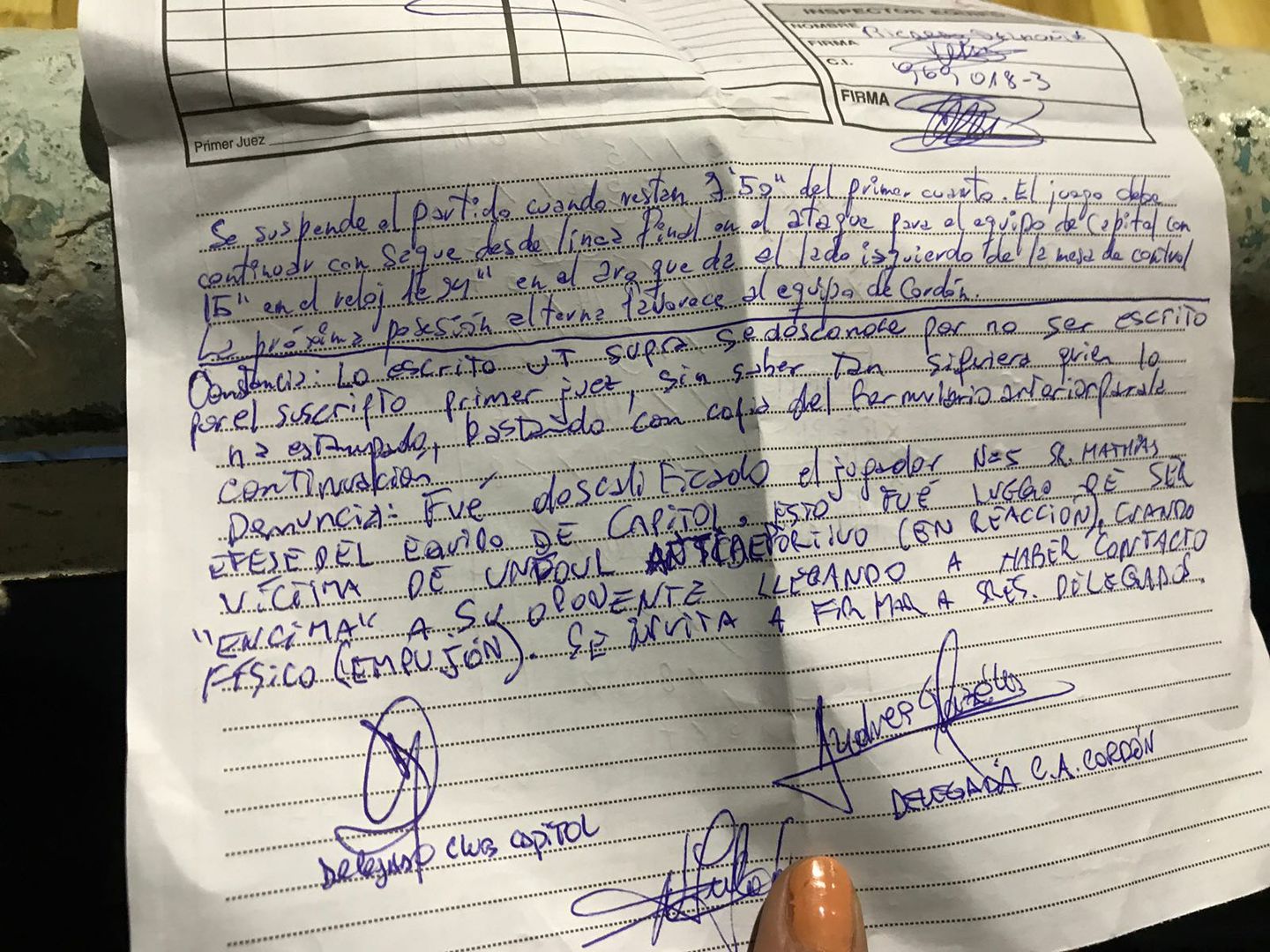 El partido se reanudó a falta de 7:50 para el final del primer cuarto con el local arriba por 6 a 2. Los de Nicolas Díaz comenzaron con Federico Sanchez, Agustin Viotti, Nicolas Ibarra, Agustin Zuvich y Dida Pereira. Mientras que la visita lo hizo con: Juan Galletto, Juan Wenzel, Rodrigo Pintos, Hector Silva y Joe Efese.