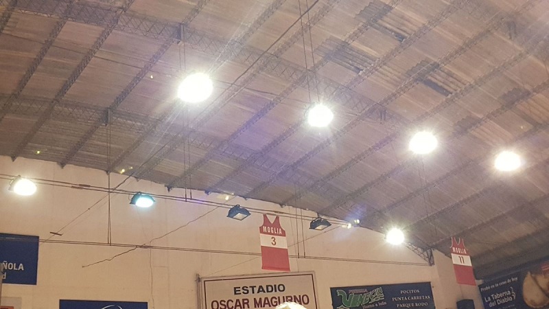 Cuando comenzaba el cotejo, se detuvo porque se apagaron de golpe tres focos sobre el aro opuesto al de la entrada, se esperó y se prendió uno. Cuando iba a dar el salto inicial, contra el aro de Emilio Frugoni se apagó otro. Se arrancó jugando, con dos de un lado y uno del otro sin prender, no queremos ser exagerados pero encaja bien que arrancó como dice el tango de Carlos Gardel, a media luz.