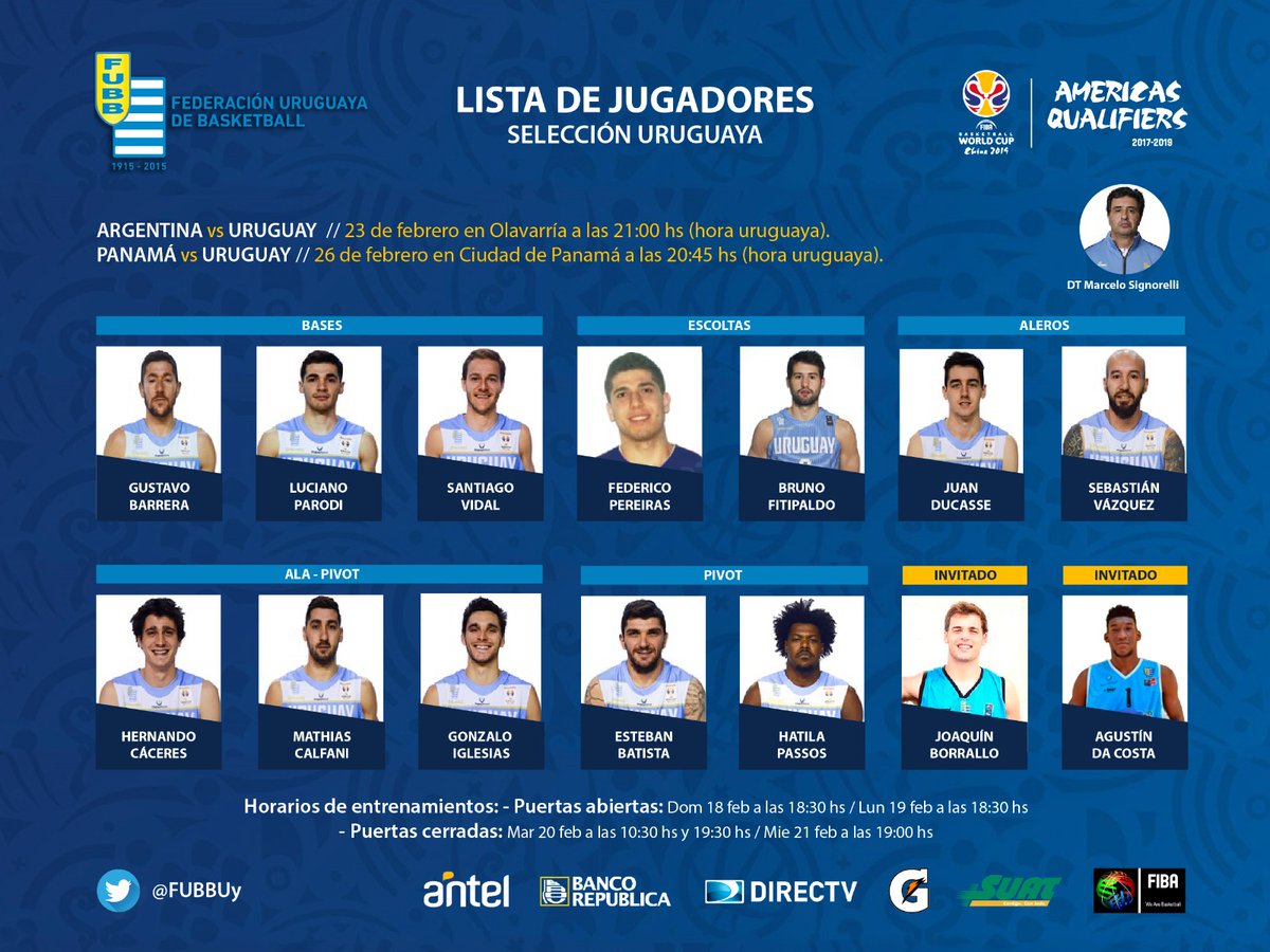 La celeste enfrentará a Argentina el 23 de febrero en Olavarría y el 26 del mismo mes va con Panamá, también de visitante. La lista tiene un solo cambio con respecto a la primer ventana, ingresa Bruno Fitipaldo y sale Salvador Zanotta. El capitán había estado lesionado cuando se disputaron los encuentros ante Panamá y Paraguay en el Palacio. Como invitados estarán Agustín Da Costa y Joaquín Borrallo.