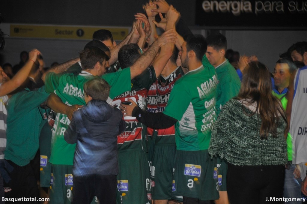 Tras una previa tan caliente como polémica, por la dura sanción a Diego García que lo dejó sin poder jugar, el playero llegaba con la chance de ser campeón, mientras el rojiverde precisaba ganar sí o sí. El inicio de Aguada fue mejor, aprovechando el tiro de media distancia de Smith, que también fue bien atacado por Hatila en la pintura contraria. Demian Álvarez generó rompiendo, y tanto el mercedario como Bavosi pusieron triples para irse cinco arriba al primer descanso. El segundo fue de amplio dominio aguatero, que llegó a tener 21 de renta con muy bien juego colectivo, triples anotados tras rotaciones del balón y destacadas actuaciones de Demian principalmente y también Smith. En base a segundos tiros Hatila descontó para el playero, y el score fue 46-29 de cara al entretiempo.