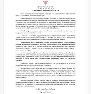 Según indica el comunicado de la dirigencia de Sayago, el jugador en las ultimas semanas no participó de los entrenamientos por disintas razones, recuperación de una lesión, estudio, hasta que el día 6 de setiembre manifestó que no se sentía cómodo en el club y quería irse.