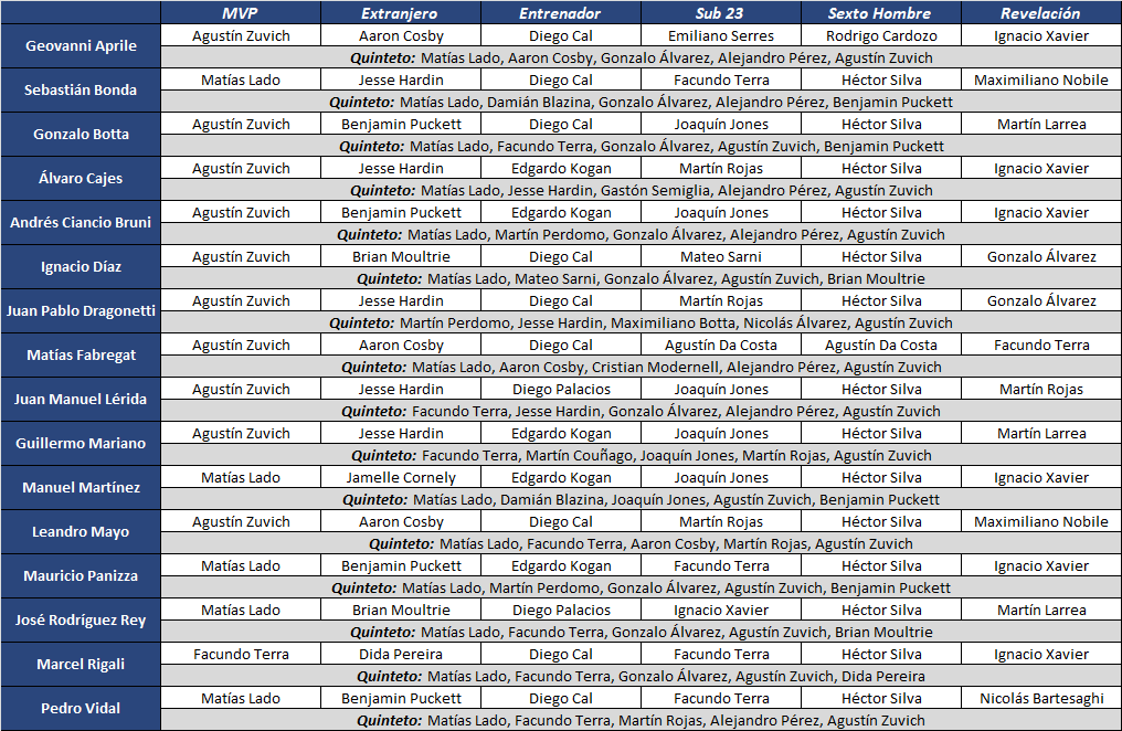 Otros candidatos: Benjamin Puckett (4 votos); Aaron Cosby, Jesse Hardin, Martín Perdomo y Martín Rojas (3 votos); Damián Blazina, Joaquín Jones y Brian Moultrie (2 votos); Nicolás Álvarez, Maximiliano Botta, Martín Couñago, Cristian Modernell, Dida Pereira y Mateo Sarni (1 voto).