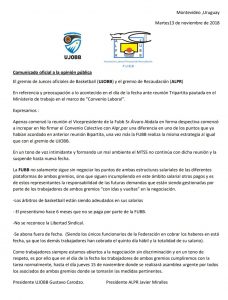 Las diferencias entre la Federación y el gremio, que vienen desde el comienzo de año ante la disconformidad con las fijaciones de partidos de formativas en un solo día, va en aumento. Según informa UJOBB, esta vez en conjunto con ALPR (gremio de Recaudación), el Vicepresidente de la FUBB, Álvaro Abdala, se negó a firmar un Convenio Colectivo con ALPR en una reunión en el Ministerio de Trabajo. De esta forma, el gremio de jueces entiende que se usó la misma estrategia que en las negociaciones con los árbitros.
