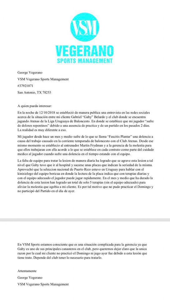 El ida y vuelta entre Gabriel Belardo y Atenas continúa. Esta vez, la agencia que lo representa sacó un comunicado acerca de la situación del boricua.