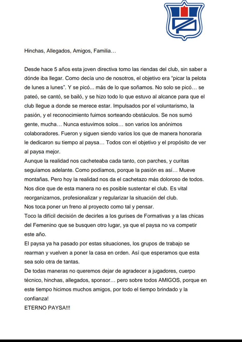 El eterno Paysa frena en la curva de fin de año. Tras un sentido comunicado la directiva que trabajó durante los últimos cinco años anunció la noticia. La institución de La Blanqueada no competirá en 2019, ni en Formativas, ni en Femenino, ni en DTA.