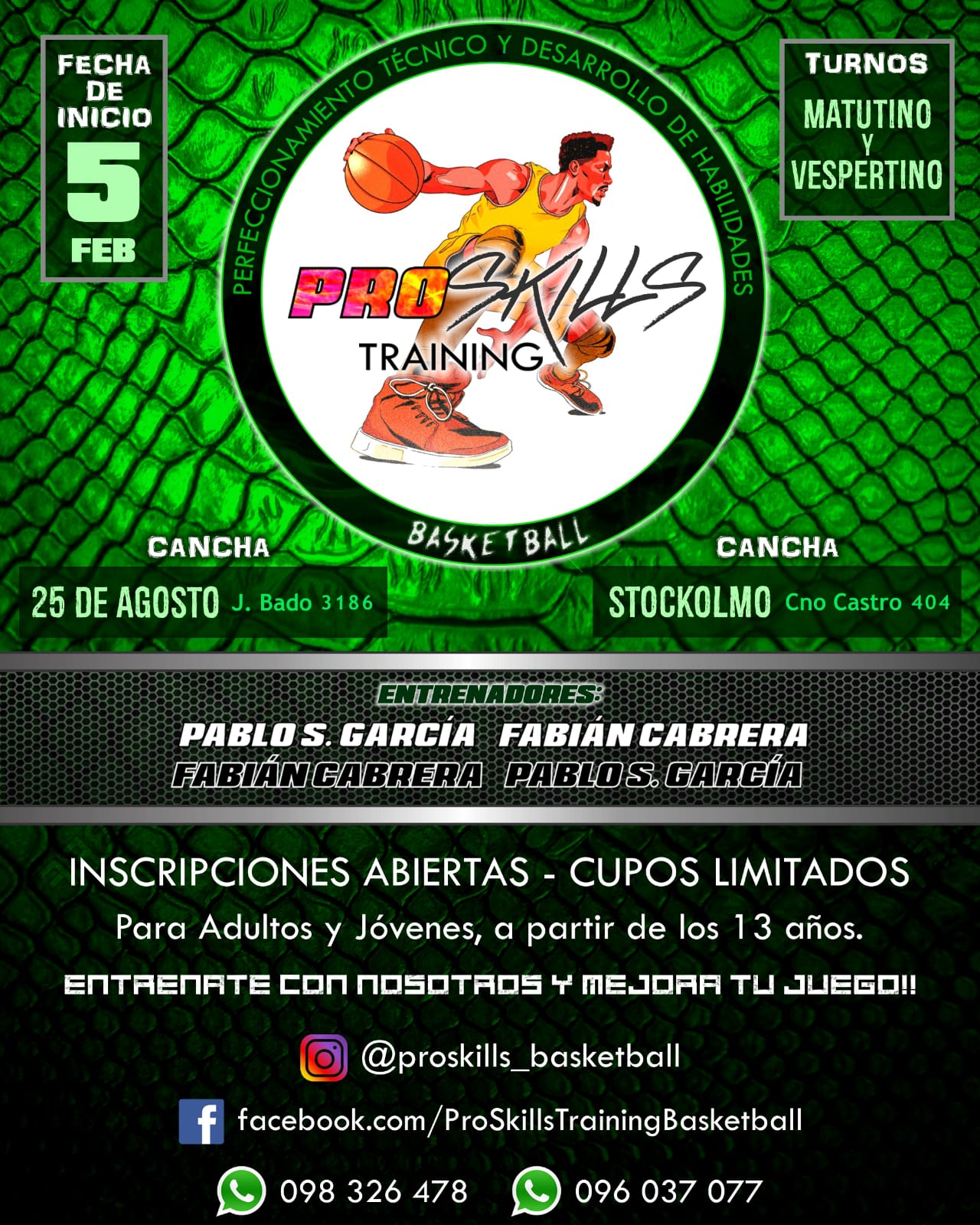 Pablo García y Fabián Cabrera son los encargados de llevar adelante este proyecto, ProSkills Training Basketball, que comienza a partir del próximo martes en cancha de Stockolmo y los jueves en el escenario de 25 de Agosto.
