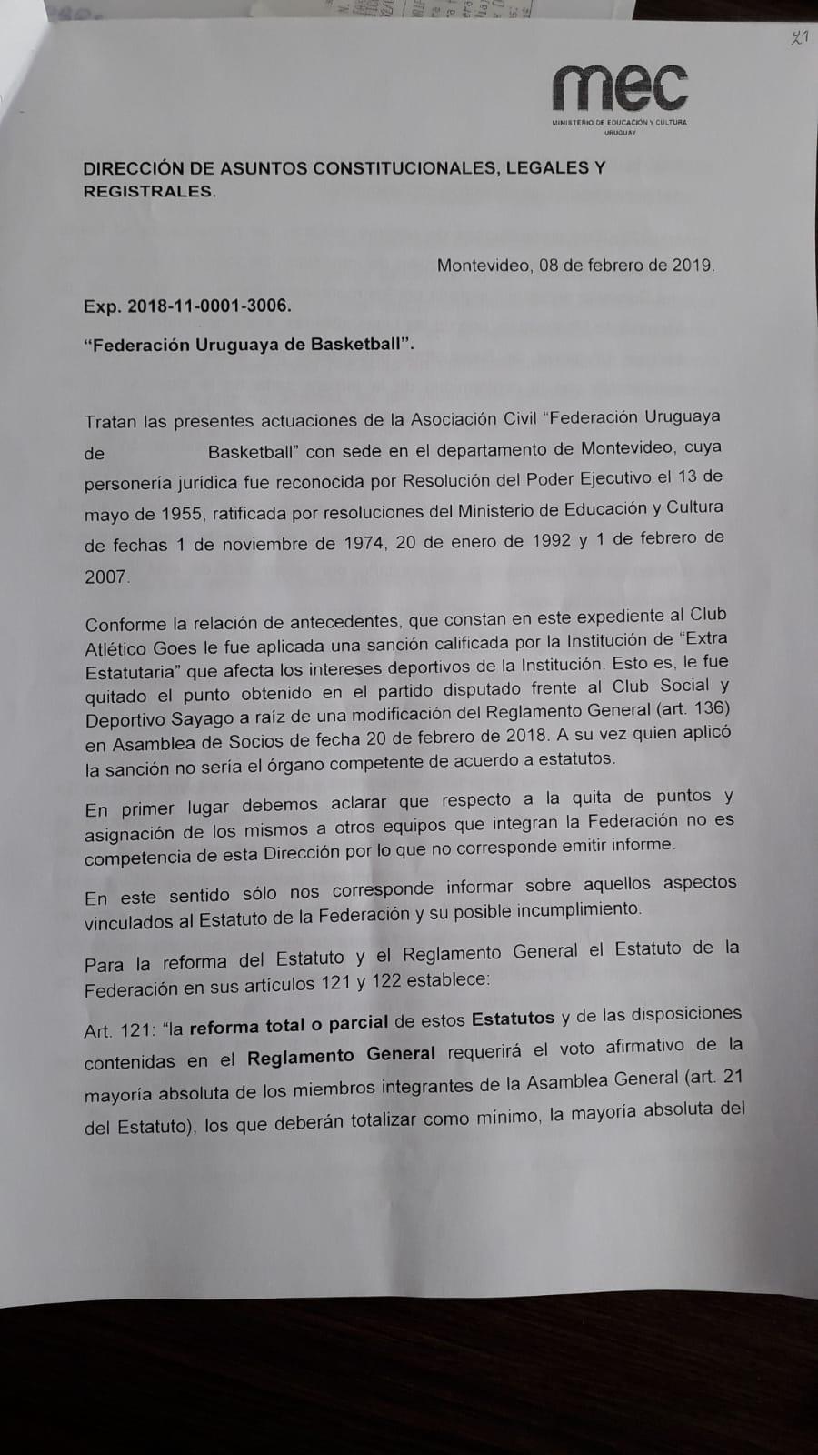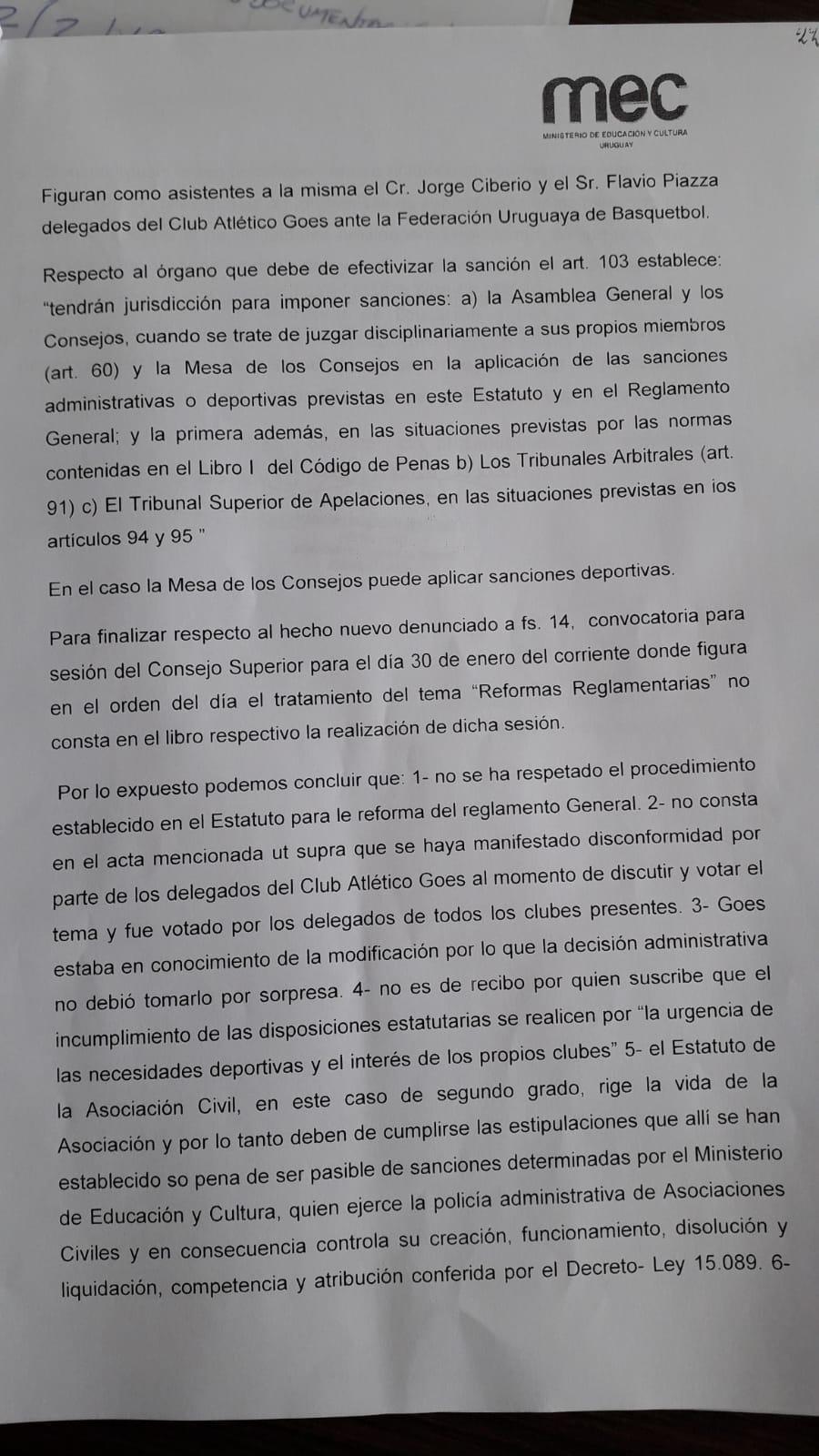 Ante el reclamo de Goes ante el Ministerio de Educación y Cultura, en reclamo del punto perdido en la fecha 1 ante Sayago, por cuatro fichas médicas válidas presentadas fuera de fecha, el MEC se pronunció al respecto.