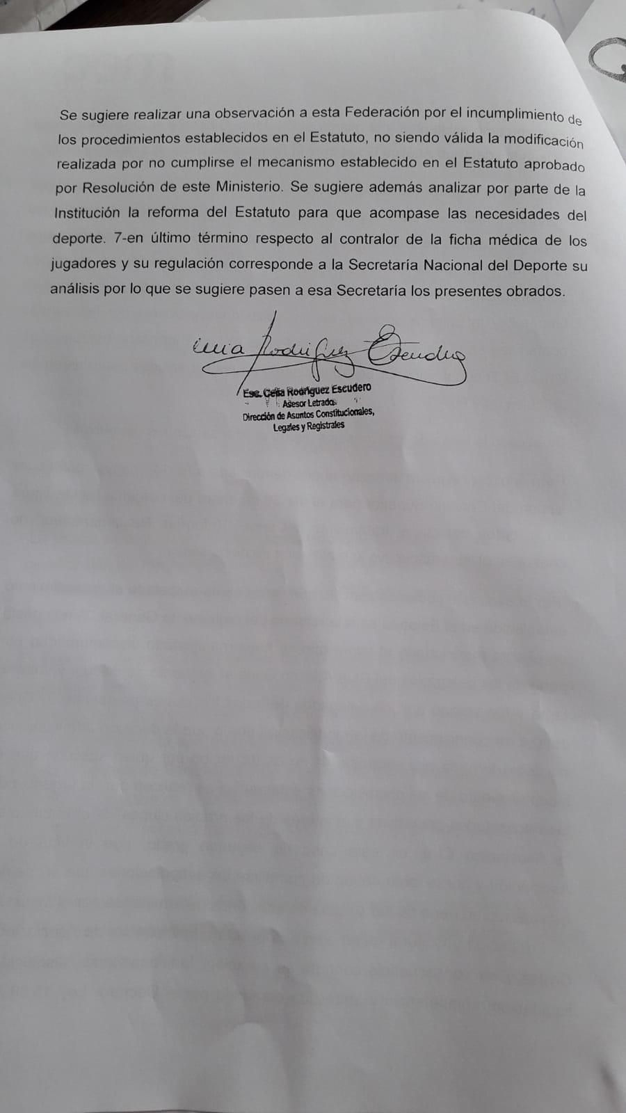 A pesar de que el Ministerio entiende que no se respetó el proceso estatutario para la reforma del reglamento, entiende que no tiene la potestad para devolverle el punto a ninguna institución. De todas formas, el MEC observa a la Federación por el incumplimiento de los procedimientos a seguir como si lo establece el estatuto. También establece que la medida al Misionero no lo puede tomar por sorpresa, debido a que estuvo presente en la Asamblea, donde los delegados de los clubes votaron a favor de esta nueva reglamentación.