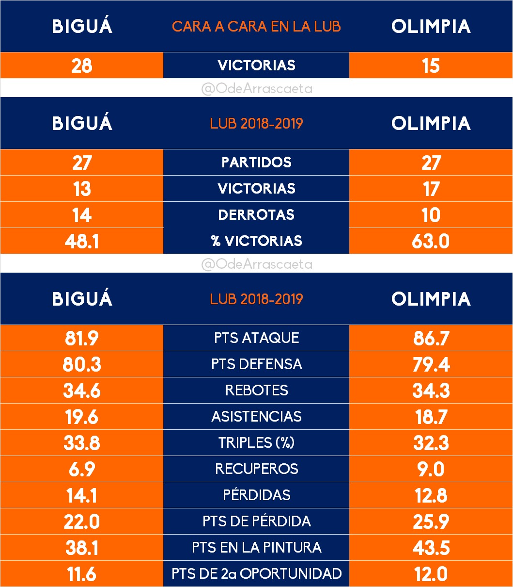 Olimpia debe aprovechar sus internos ágiles para atacar desde el pick con Young, que no llegó en su mejor forma física. Defender intenso para correr será clave, tanto como defender duro a Hinkle, con quien seguramente rotarán Loriente y García. Biguá necesita de Martín Osimani en su mejor versión, para generar y anotar, dominar el ritmo de juego y la regularidad en los 40 minutos son puntos importantes.