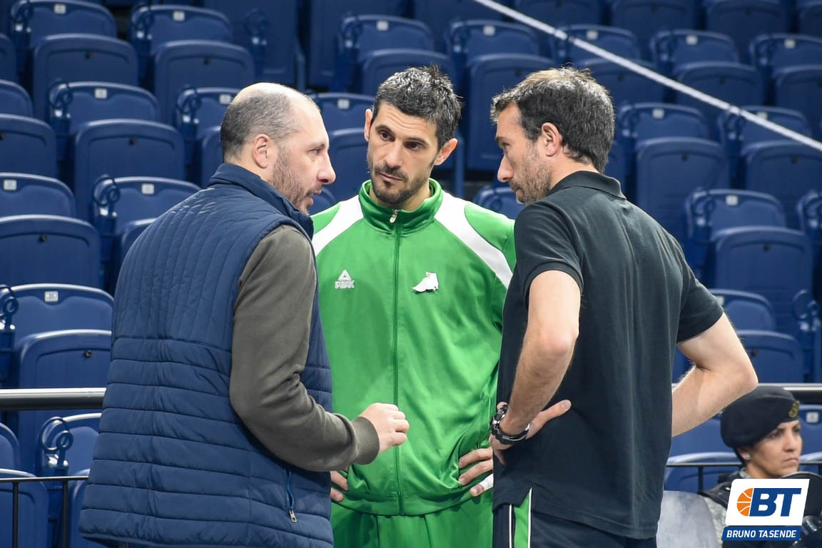 Leandro García Morales, como siempre, faltando casi dos horas para el partido ya estaba tirando al aro. Eso no es distinto. En el medio de su rutina apareció Nicolás Mazzarino, de particular, vino a saludarlo. Se quedaron hablando entre 20 y 30 minutos. Nosotros mirabamos de lejos, con unas ganas enormes de tener un handie cerca y escuchar esa charla, que no sabemos si era de básquetbol, de sus familias, o de sus vida. Pero estamos seguros que escuchar a esas dos bestias es sinónimo de aprendizaje, sea cual sea el tópico de la conversa.