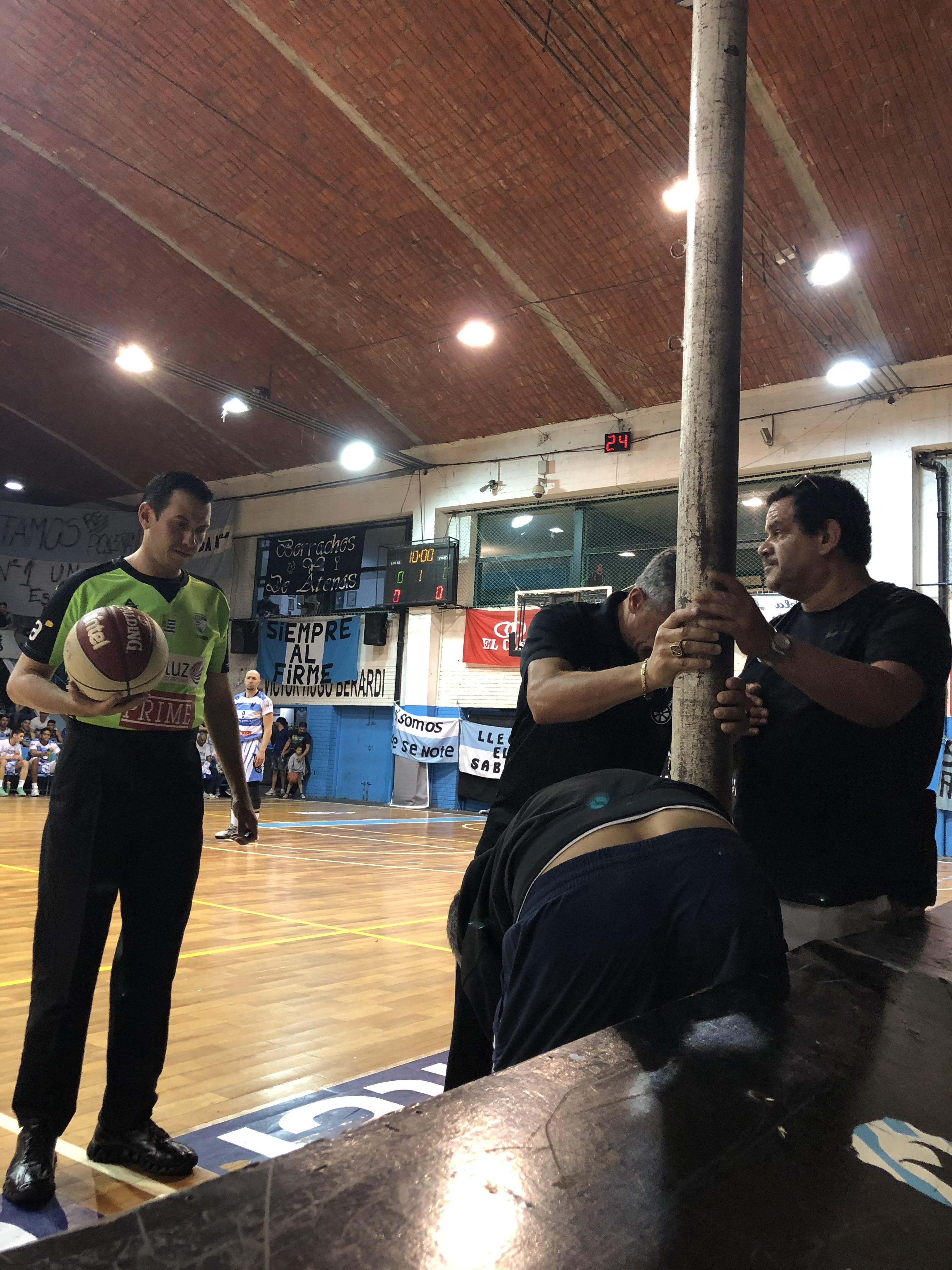 La cancha de Atenas posiblemente sea de los rectángulos con más rayas en su piso debido a la cantidad de deportes que allí se practican. Hay líneas amarillas, rojas, celestes como para que uno se entretenga. Uno de los deportes que se practican en el recinto es el voleyball y fue el gran dolor de cabeza en el inicio del juego. Es que uno de los soportes donde se coloca la red había quedado puesto y la terna arbitral alertó de la situación dado que el peligro de su presencia era evidente. Parecía sencillo su retiro por lo cual rápidamente llegó una persona, pero dio claros indicios que no podía. Rápidamente se arrimó el segundo a colaborar, tampoco pudieron. Llegó un tercero para ayudar a la causa que parecía tener la solución. Los tres hombres, con mucha voluntad, no pudieron con el soporte rebelde que parecía realmente inamovible. Ante esta situación, la presencia de Bartel no se hizo esperar, quien cansado de la demora y desconsolado ante la situación, gritó: “ya está muchachos, déjenlo así”. La naranja fue al aire y el soporte rebelde se quedó allí… los 40 minutos.