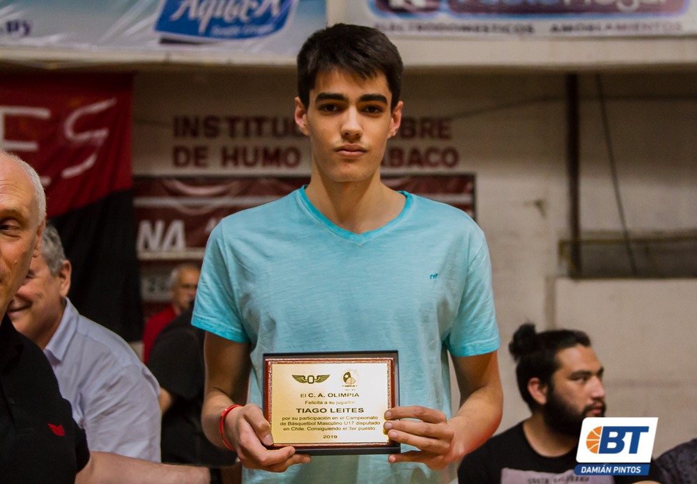 En la previa al juego, Olimpia le hizo un reconocimiento a Tiago Leites, juvenil del club, que participó recientemente del Sudamericano U17 que se disputó en tierras chilenas. La selección dirigida por Marcelo Capalbo se quedó con la medalla de bronce y con la clasificación al Premundial U18 que se llevará a cabo el próximo año. El jugador que en su club se desempeña como base, pero que con la celeste lo hace de escolta, promedió 5.6 puntos y 1.8 rebotes en los 17.7 minutos que permaneció en cancha. Es un pibe en el cual los de Colón tienen muchas expectativas, ya que posee una estatura (1.96m) poco habitual en un armador.