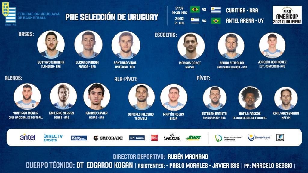 Los bases serán Luciano Parodi (Franca), Gustavo Barrera (Flamengo) y Santiago Vidal (Unifacisa), todos ellos en Brasil. Como escoltas estarán Bruno Fitipaldo (San Pablo Burgos, España), Joaquín Rodríguez (Estudiantes de Concordia, Argentina) y el playero Marcos Cabot. Los aleros serán el tricolor Santiago Moglia y los jóvenes de Obras Sanitarias Emiliano Serres e Ignacio Xavier. Los ala-pívots serán locales, Gonzalo Iglesias de Trouville y Martín Rojas de Biguá, completando la lista los tres habituales pívots: Esteban Batista (San Lorenzo, Argentina), Hatila Passos (Nacional) y Kiril Wachsmann (Malvín).