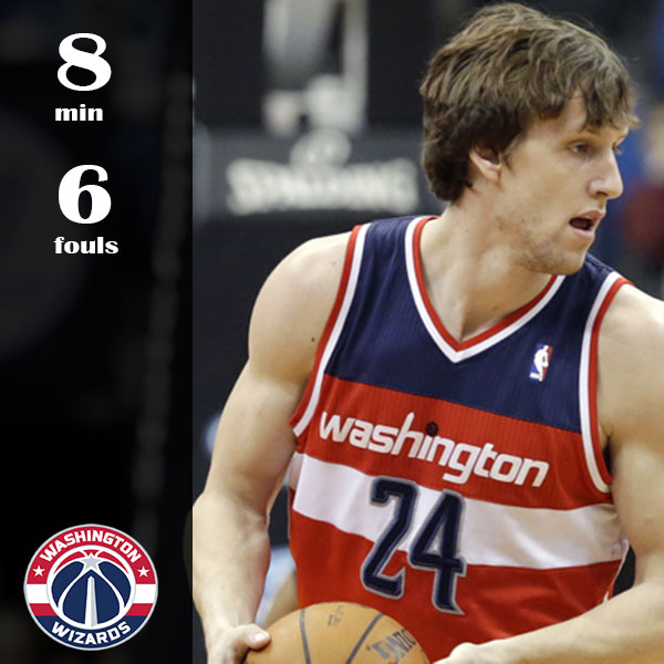 Seguimos en año 2013 pero cambiando de equipo hacia los Washington Wizards nos encontramos con el peculiar partido de Jan Vesely. Como le puede pasar a cualquier jugador Vesely se vio obligado a abandonar el flotante en determinado punto del juego debido a que cometió 6 faltas personales, entonces ¿qué hay de curioso en este partido? Que la 6 faltas del 24 capitalino fueron en 8 minutos de acción, aproximadamente una falta cada 1.3 minutos, una locura.
