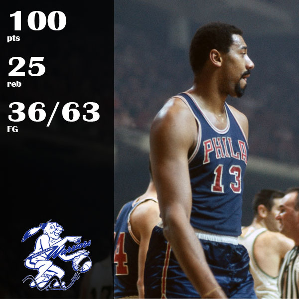 Comencemos con un juego reconocidísimo ya que este es el récord de puntos en un solo partido en la NBA. Así es hablamos del mítico Wilt Chamberlain quien en la temporada de 1962 con la casaca de Philadelphia Warriors puso 100 puntos tirando un 36/63 en tiros de campo y además bajando 25 rebotes. Pero el centenar de unidades no es el único récord que se estableció aquella noche, Chamberlain también marcó la mayor cantidad de puntos en una mitad con 59 (2da parte) y la mayor cantidad de tiros de campo anotados e intentados tanto sea para un partido como para una mitad del mismo. Sin duda aquella fue una noche para el recuerdo donde el famoso Wilt estableció apenas 6 de los 72 récords que tiene en la NBA.