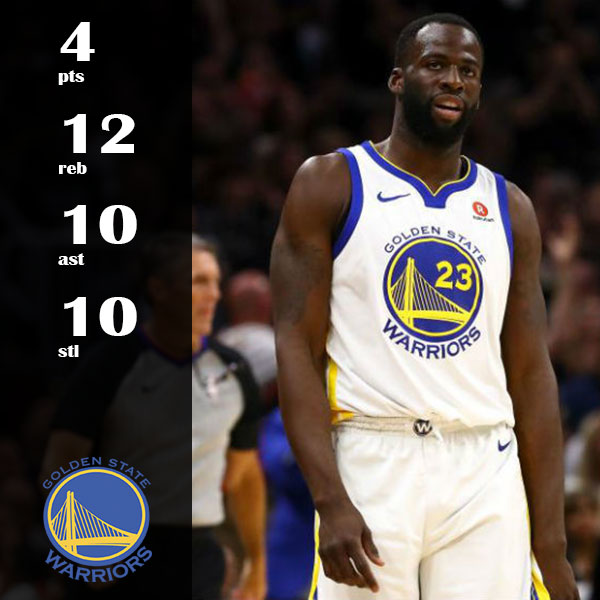 Quien viene a continuación es Draymond Green quien en el correr del año 2017 con la casaca de los Golden State Warriors consiguió algo sin precedentes. Aquello fue un muy particular triple-doble en el que apenas puso 4 puntos, pero bajó 12 rebotes, dio 10 asistencias y robó 10 balones, convirtiéndose así en el primer jugador en conseguir una triple decena sin superar la decena de unidades la cual fue además la primera con al menos 10 rebotes, 10 asistencias y 10 robos.