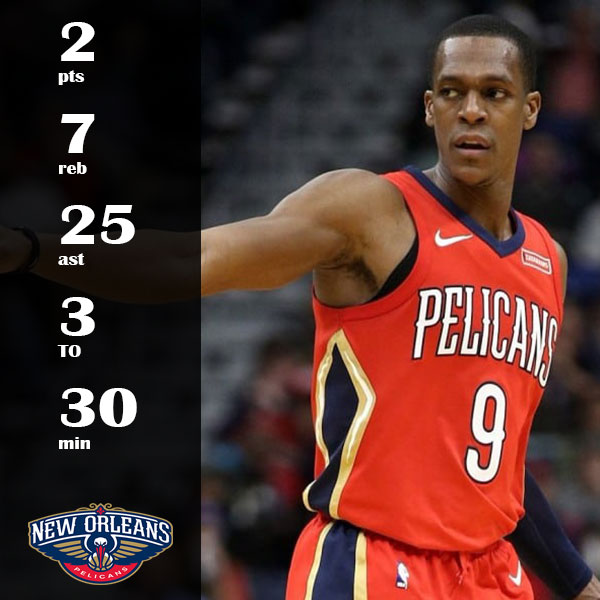 Vayamos a otro de esos juegos donde queda claramente marcado el rol de un jugador en un equipo, tal y como vimos con Rodman en el informe pasado. Seguramente varios recuerden este juego donde Rajon Rondo demostró su vigencia jugando para los New Orleans Pelicans en el año 2017. En aquella oportunidad el base apenas anotó 2 puntos, bajó 7 rebotes y dio 25 asistencias, cometiendo apenas 3 pérdidas y todo eso en 30 minutos. Este fue el 8vo juego con más de dos decenas de asistencias ya que consiguió dar 20 pases gol en 5 oportunidades, 23 en una (21 en tres cuartos) y 24 también en una oportunidad. En las dos últimas tuvo la particularidad extra de que ambas acompañaron un triple-doble y que cuándo el dio 23 asistencias fueron más que las de su rival entero, mientras que cuando hizo 24 igualó a todo el equipo contrario sumado.
