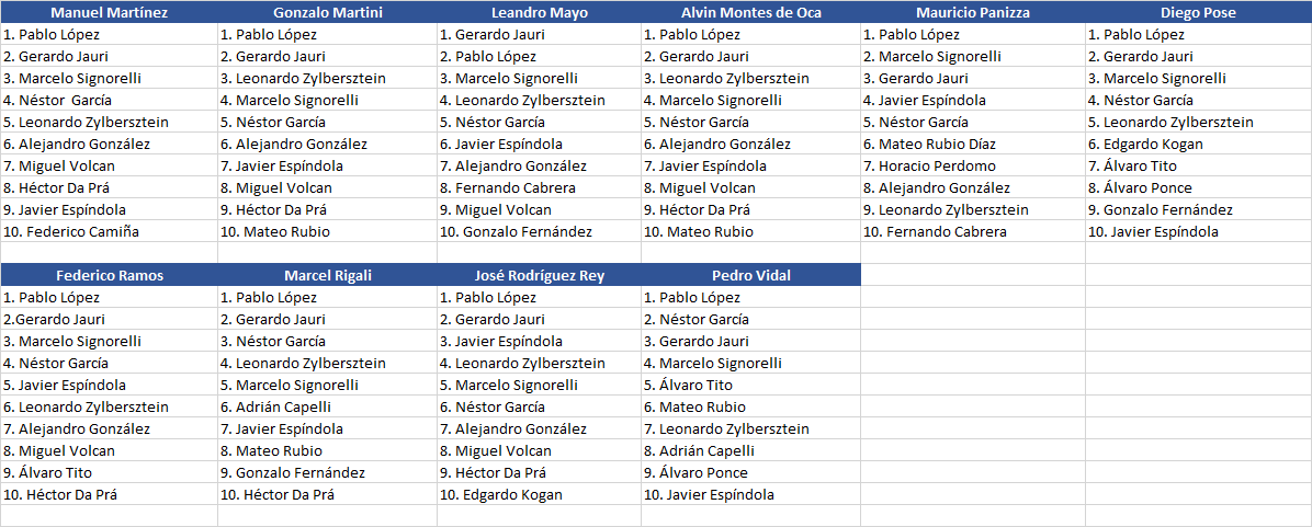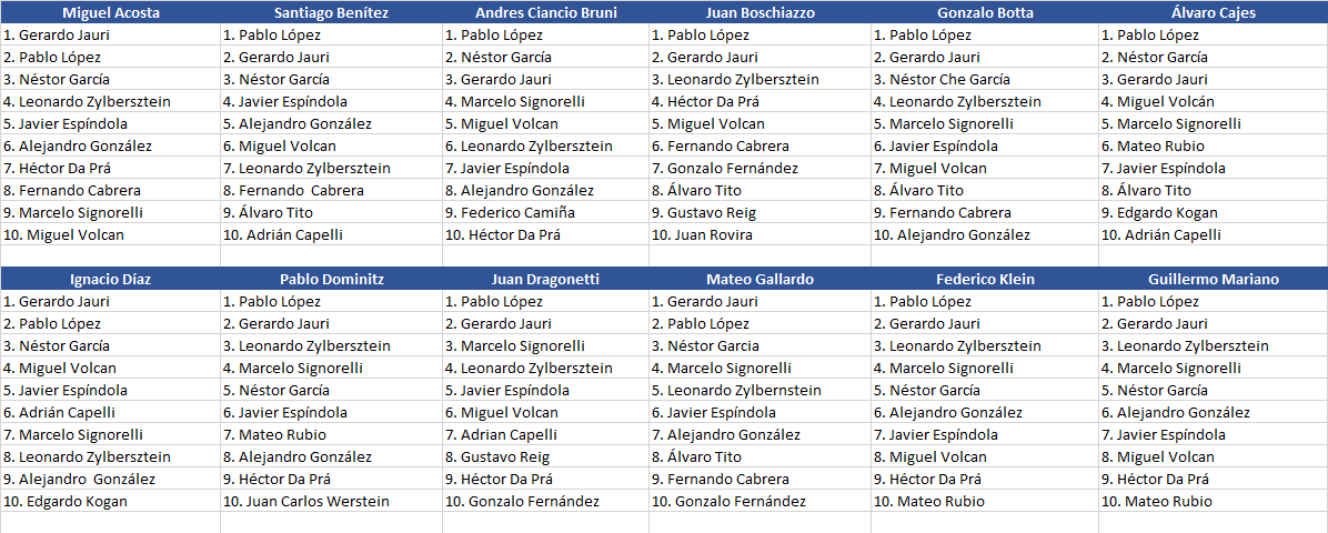 En la votación de cada integrante del equipo, los puntos se dividen asi: el número uno recibe 10 puntos, el número dos, nueve puntos, así sucesivamente hasta llegar al diez que recibe un punto.