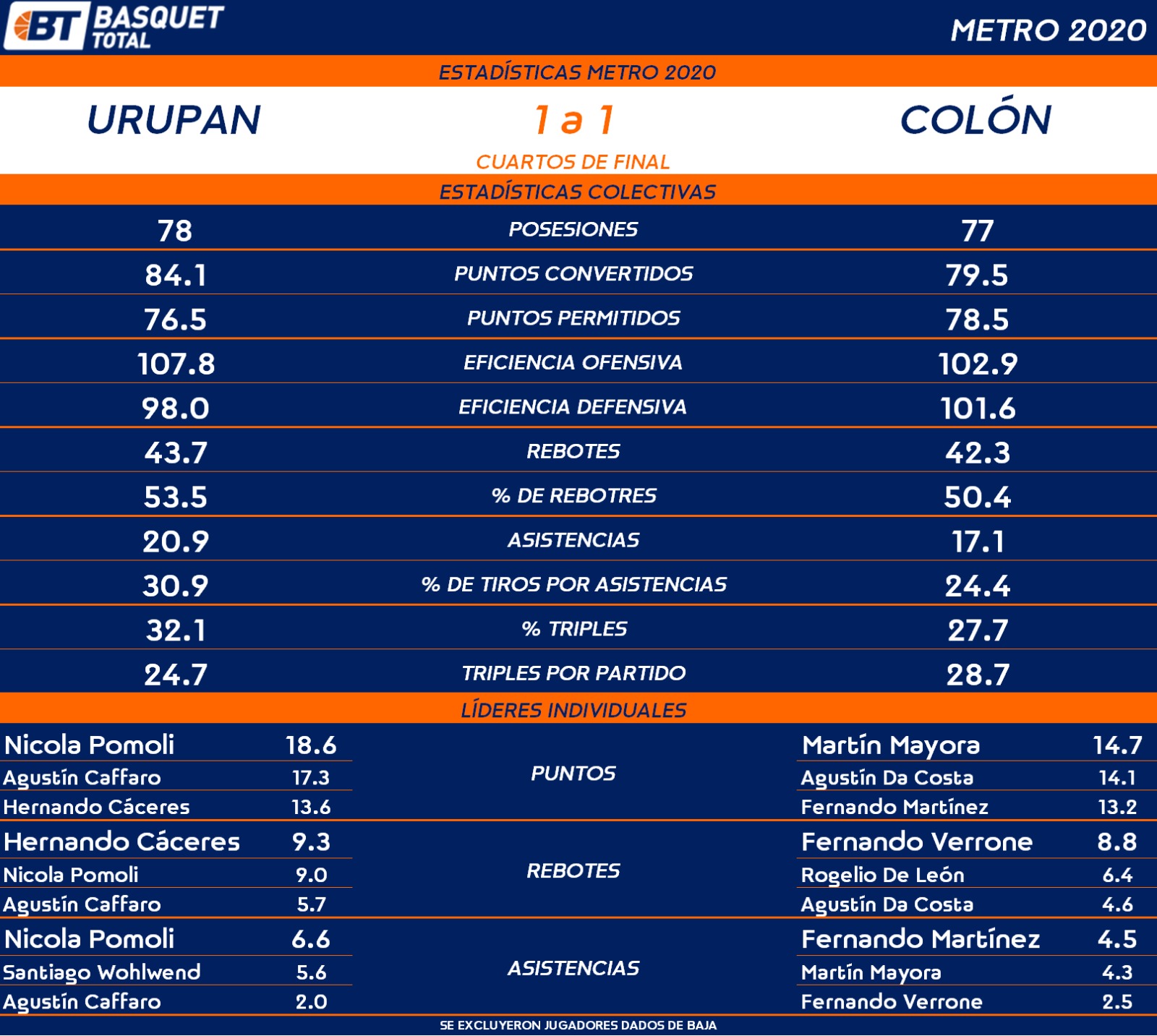 Al igual que el pasado encuentro y dadas las bajas en los de San Martin y Fomento resulta clave saber quien ganará el duelo en la pintura. Para plantarse ante Cáffaro y Hernando; Verrone y Monteverde deberán estar muy enchufados. Y la energía que consuman en defensa seguro les pase factura del otro lado del rectángulo, en ataque. Y ante la baja del Enano, Verrone necesitará anotar si quiere que su equipo gane. Colón debe abrazarse a su plan de juego, seguramente con una zona cerrada y no malgastar ni una sola caloría porque será un partido sumamente intenso. Por el lado de Urupan, la gran clave de la noche es mantener la compostura, por juego y por plantel se debería quedar con la llave, pero ya perdió una vez y bien lo puede volver a hacer. Mantener la calma para encontrar la forma de entrarle a Colón y dominar el ritmo de juego pueden ser determinantes para que el pandense se meta en semifinales.