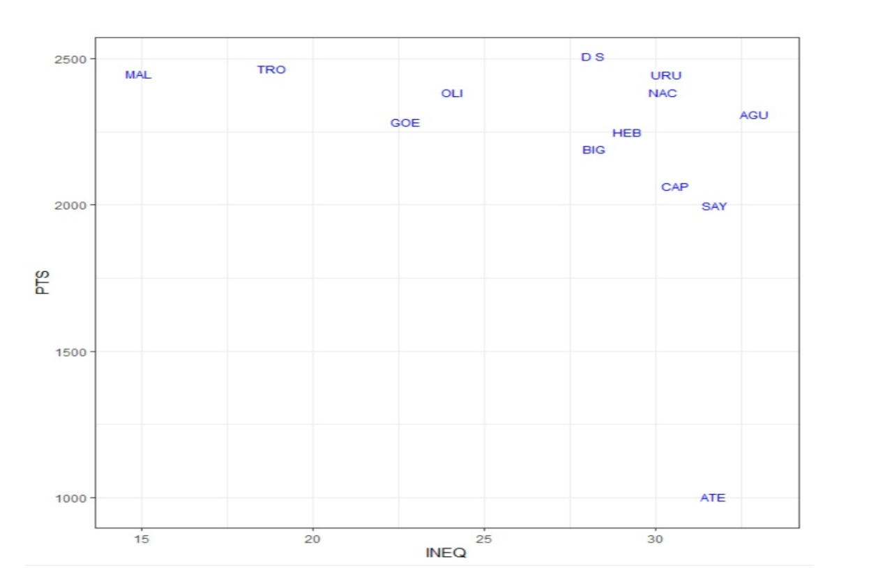 En la siguiente tabla podemos ver la desigualdad respecto a quienes anotan los puntos, los más “desiguales” (INEQ) son los equipos que se centran en una menor cantidad de jugadores para anotar, por contrapartida los menos desiguales son los equipos que más balanceado (distribuido) tienen la generación de puntos.