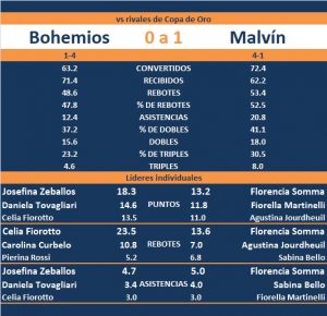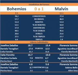 Malvín precisa de mejores porcentajes de afuera si no quiere sufrir los minutos de zona rivales. Tiene manos confiables como para abrir esa defensa, como las de Florencia Fernández, Fiorella Martinelli y Emilia Larre Borges. Desde su aceitada rotación de balón puede generar buenos tiros; y también generar ventajas a partir de los rompimientos de Sabina Bello y Florencia Somma. En la longitud de su plantel puede sacar su principal ventaja. Bohemios en una noche ventosa o de malos porcentajes puede conseguir mucho rédito desde su defensa zonal. En ataque Pierina Rossi ya demostró que puede hacerse cargo de la generación, pero precisará más de Daniela Tovagliari. Si la noche no conspira contra su tiro de tres puede ser un arma importantísima para el elenco albimarrón. Para ello puede utilizar las indirectas de Aranzazu Sureda y Carolina Curbelo para tratar de liberarla de una marca pegajosa. El rol de Curbelo en este caso puede ser una herramienta a utlizar en ofensiva, sabiendo que el juego pasado dominó en el juego interno.
