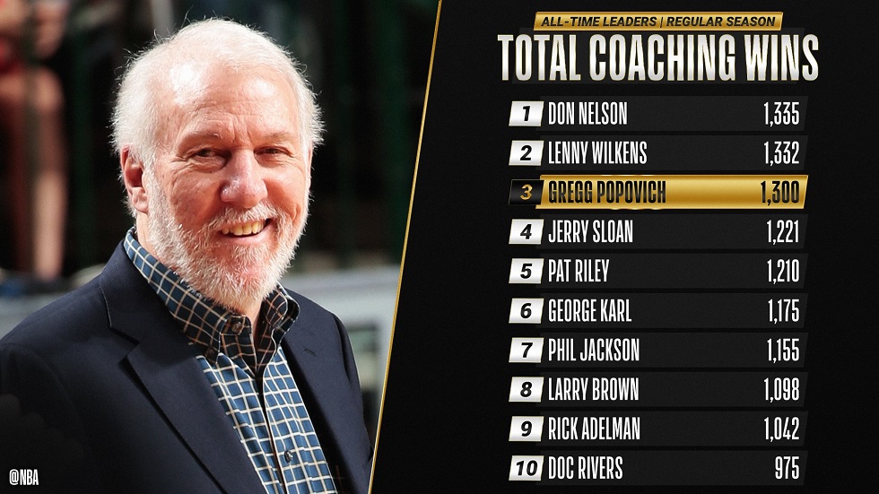 En el triunfo ayer de San Antonio en casa frente a Chicago, Gregg Popovich llegó a las 1.300 victorias en su carrera como entrenador. El legendario coach de los Spurs, que lleva 24 temporadas y media en el banquillo del conjunto texano, se convirtió en el tercero que alcanza al menos dicha cifra. Don Nelson y Lenny Wilkens son los únicos que lo superan, con la particularidad que entre ellos apenas suman un título, mientras que el nacido en Indiana tiene cinco anillos en su poder. Si no sucede nada extraño, el histórico director técnico de los Spurs se convertirá muy pronto en el entrenador con más victorias en la historia de la liga. No te vayas nunca Pop.