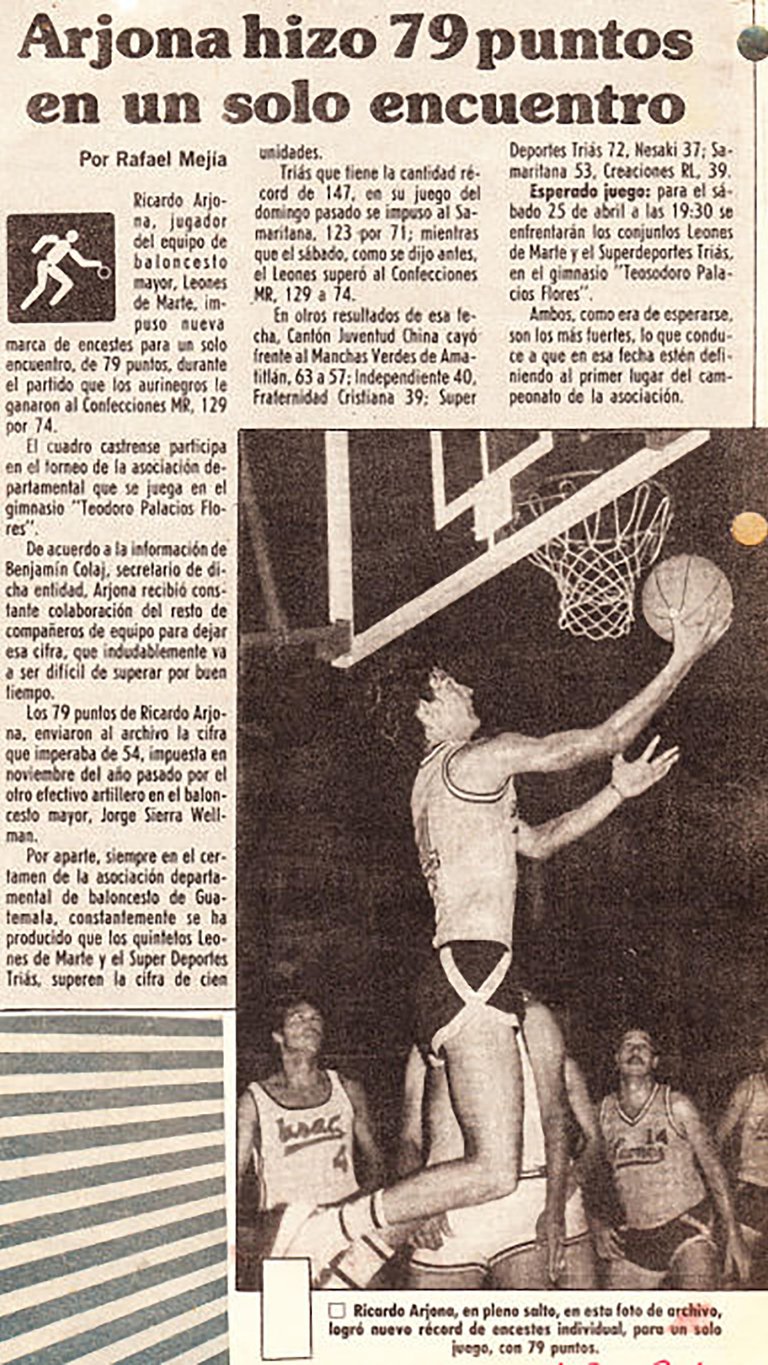 Ricardo Arjona (1.95). Jugó de base y luego fue escolta o alero anotador, supo ser parte de la selección juvenil guatemalteca y llegó a meter 79 puntos con el Atlético Marte de su país en un partido en 1987, marca que recién fue batida en 2005. Luego se fue a México en busca su desarrollo como músico, ya que en Guatemala no parecía haber mucho margen de desarrollo en el deporte de sus amores.
