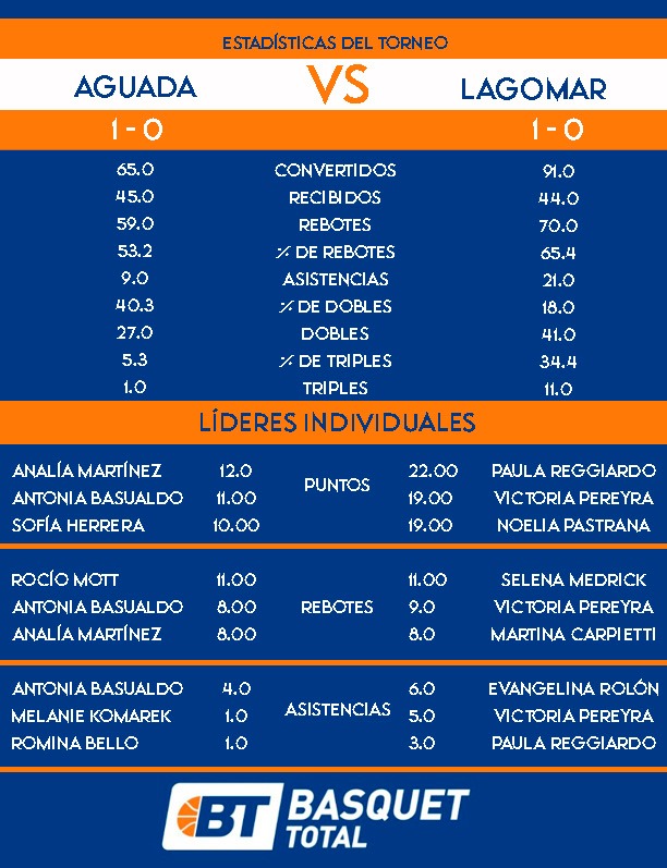 Lagomar superó en su debut con claridad a Capurro, 91-44, dejando una imagen de un buen proyecto que puede dar pelea. Aguada viene de amargar a un debutante, Urunday Universitario, al que superó 65-45, con un alto caudal de puntos de contraataque. Contará con el debut de su extranjera Kelly Orejuela.