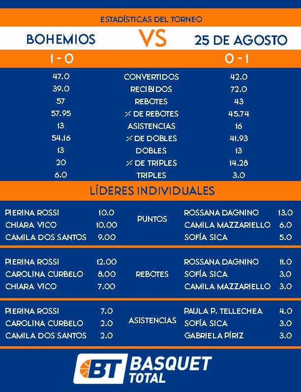 Bohemios superó en un trabajado partido a Yale, 47-39, en un juego en el que dejó dudas. 25 de Agosto fue aplastado por Hebraica y Macabi, 72-42, en un partido en el que puede rescatar su primer cuarto en el que dañó desde su verticalidad. Contará con el debut de Rocío Berdeihl, su extranjera. Está en duda, Sabrina Molina.