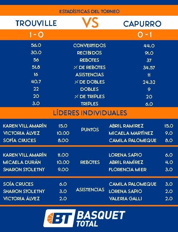 Si bien Trouville pudo correr en su estreno, parece un equipo con más soluciones en el 5x5. Bajar el ritmo puede serle útil a la "T" ante un rival que necesita correr. En el bajo, el control de Camila Palomeque es importante, al igual que generarle espacios en la pintura a Karen Villamarín y Silvina Páez. Desde la conducción de Sofía Cruces o Victoria Álvez, puede conseguir un traslado seguro y un caudal de asistencias importantes, que le dieron mucho de comer en el primer tiempo de la fecha 1.