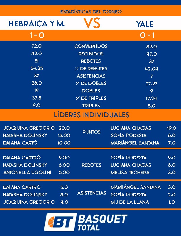 Macabi viene de vencer con comodidad a 25 de Agosto en su debut, por 72-42. Contará con el debut de su extranjera, Ana Paz. Sofía Bergdahl, ausente en el primer partido por una fisura en su costilla, estaría a la orden. Yale viene de hacer un excelente partido ante Bohemios, en la derrota 47-39 ante las marronas. Si bien el equipo dejó una gran imagen defensiva, pecó de bajos porcentajes y problemas para contener el rebote en su aro.