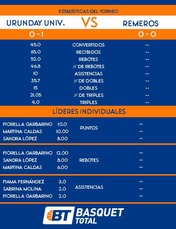 Urunday Universitario no tuvo un auspicioso debut ante Aguada, ante quien cayó por 65-45. Remeros hará su estreno en el torneo, tras haber alcanzado las finales de la Copa de Plata en el anterior certamen. Mantuvo gran parte de su plantel y consiguió dos campeonas como refuerzos de lujo, Sylvie Bouissa y Gianina Tiscornia.