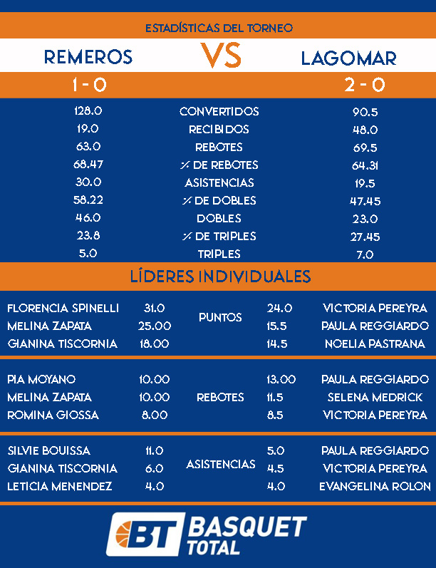 Remeros ha mostrado un gran rendimiento colectivo en su primera presentación. El regreso de Florencia Spinelli a las canchas significó uno triunfal al rectángulo de juego. Las caras ya conocidas de Melina Zapata y Pía Moyano han generado desde adentro de la pintura hacia afuera y seguramente con el correr de los encuentros la incorporación de Silvie Bouissa y Gianina Tiscornia se irá aceitando en el andamiaje de un equipo que tiene mucho para crecer.
