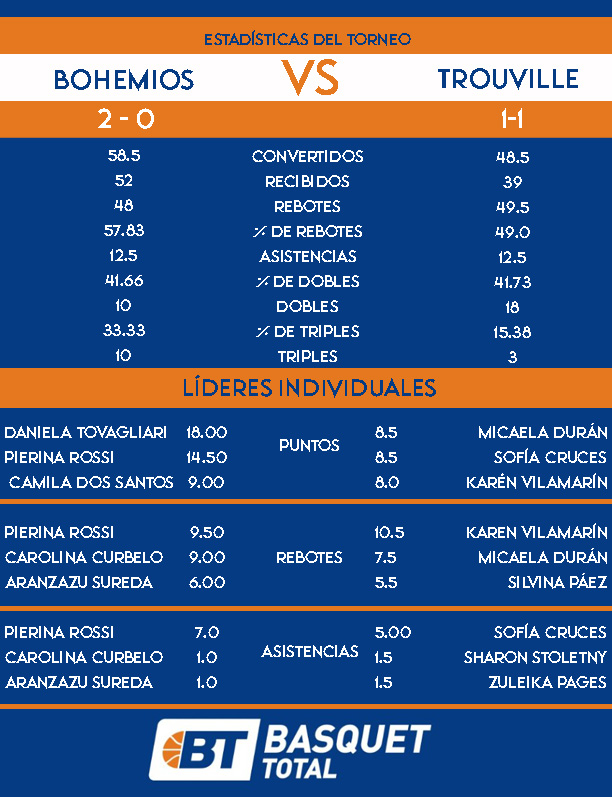 Bohemios juega al ritmo que Pierina Rossi quiera. La base ha sido una jugadora desnivelante en las dos primeras fechas y a partir de su velocidad y desfachatez juega su equipo. Los espacios generados por la base, son bien aprovechados por Daniela Tovagliari que es una tiradora que vive con el aro entre ceja y ceja.