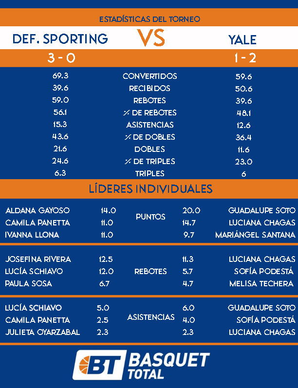 Ante un equipo súper fuerte defensivamente, Yale necesitará nivelar desde su defensa agresiva. Será importante dar con los emparejamientos perimetrales, en una zona que su rival tiene mucho gol. En ataque precisa elevar sus porcentajes ante un equipo de Gino Alderete que tiene muy bien trabajadas sus defensas zonales. Su debe hasta ahora, fue el no poder liberar a Mariángel Santana para tirar, aunque al buen arranque del torneo de Luciana Chagas, suma la mano de Guadalupe Soto, que si afina la puntería puede ser peligrosa. El traslado de Sofía Podestá debe ser seguro ante un equipo que defiende bien arriba. El juego de Melisa Techera en el bajo será importante, para detener a Josefina Rivera y cuando ha cambiado en las cortinas en las primeras fechas, ha contenido de muy buena manera.