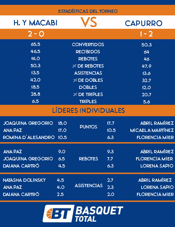 Hebraica y Macabi llega con un récord de 2-0, habiendo ganado dos partidos pesados en el arranque. Descansó la semana pasada, lo que le sirve para reinsertar a Ana Paz en el equipo. Capurro viene de dejar una gran imagen en su caída ante 25 de Agosto, pese al récord de 1-2 con el que llega al choque de esta tarde.