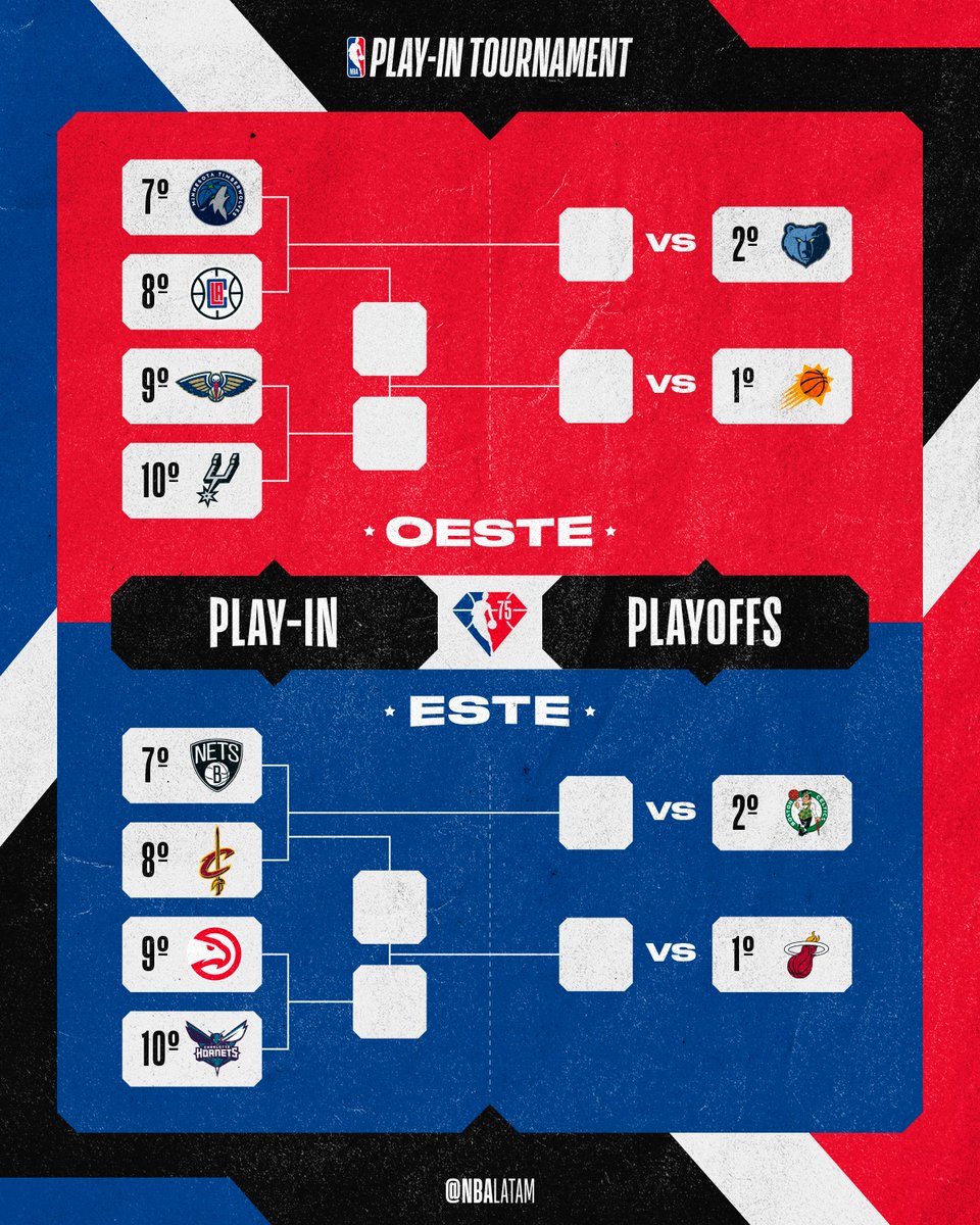 Para ponerle caras al asunto, en el Este los Brooklyn Nets (séptimos) recibirán este martes a las 20 horas en el Barclays Center de Brooklyn a los Cleveland Cavaliers (octavos). El ganador de ese único duelo quedará emparejado con los Boston Celtics (segundos), teniendo que disputar el primer partido este domingo. A segunda hora y por el Oeste, los Minnesota Timberwolves (séptimos) recibirán a Los Ángeles Clippers (octavos) a las 22:30 en el Target Center de Minneapolis. Quien resulte victorioso se enfrentará el sábado a los Memphis Grizzlies (segundos).
