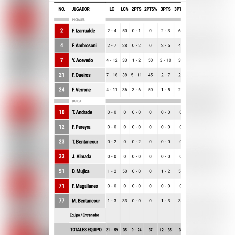 Izarrualde (4): No logró incidir de arranque, levantó en el último cuarto. Ambrosoni (4): Mala noche de uno de los goleadores del equipo. Acevedo (6): Sus bombas aisladas sostuvieron durante un rato al equipo. Verrone (5): No jugó mal el flaco pero le costó defender al goleador de la noche. Queiros (7): Lo mañataron, lo ofuscaron y de a ratos se enojó. Con todo ello, aún así logró ser el mejor de los suyos. Mujica (5): Un buen primer ingreso pero poco más. M.Bentancour (6): Aceptables minutos en un contexto desfavorable. T.Bentancour (5): No pudo hacer mucho. Pereyra (5): Sin mucha incidencia. Almada, Magallanes (-): Apenas en cancha. Giacoya (4): El equipo se desdibujó en cierta parte por las ventajas que dio en defensa, permitiendo anotaciones fáciles durante el tramo de quiebre.